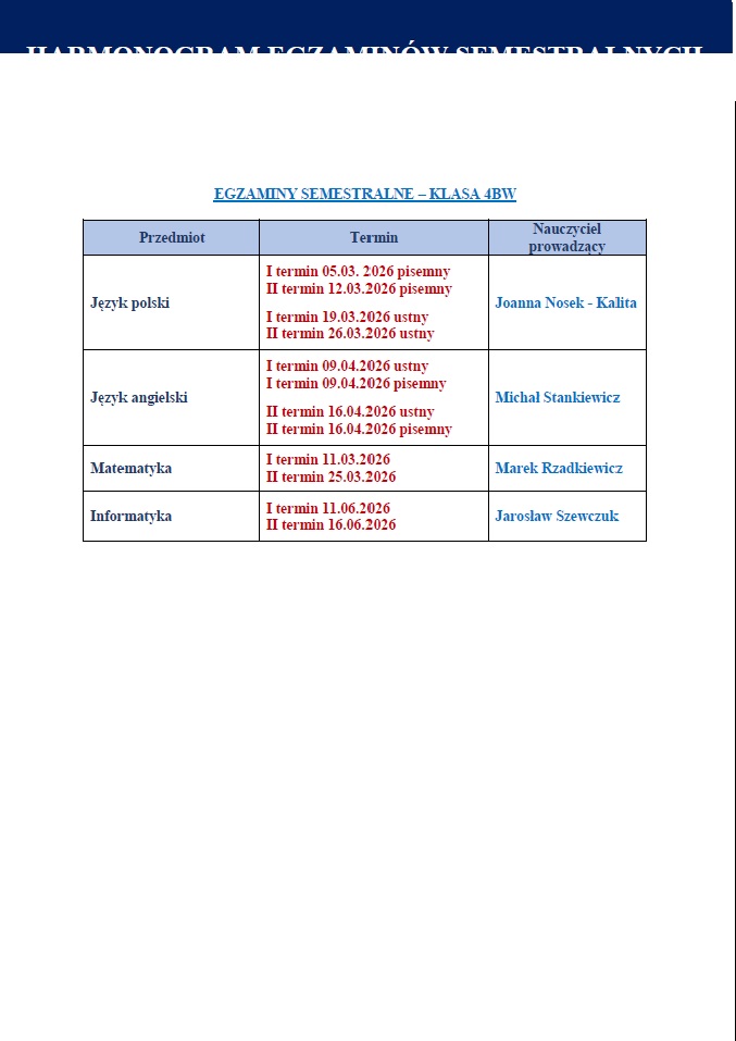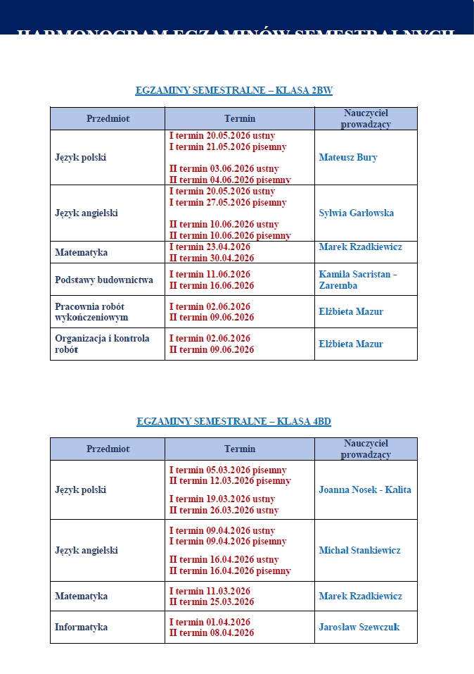 EGZAMINY SEMESTRALNE - SZKOŁA BRANŻOWA II STOPNIA - Państwowe Szkoły Budownictwa im. prof. Mariana Osińskiego (Technikum nr 5, Branżowa Szkoła I stopnia nr 5, Szkoła Policealna dla Dorosłych nr 5)
