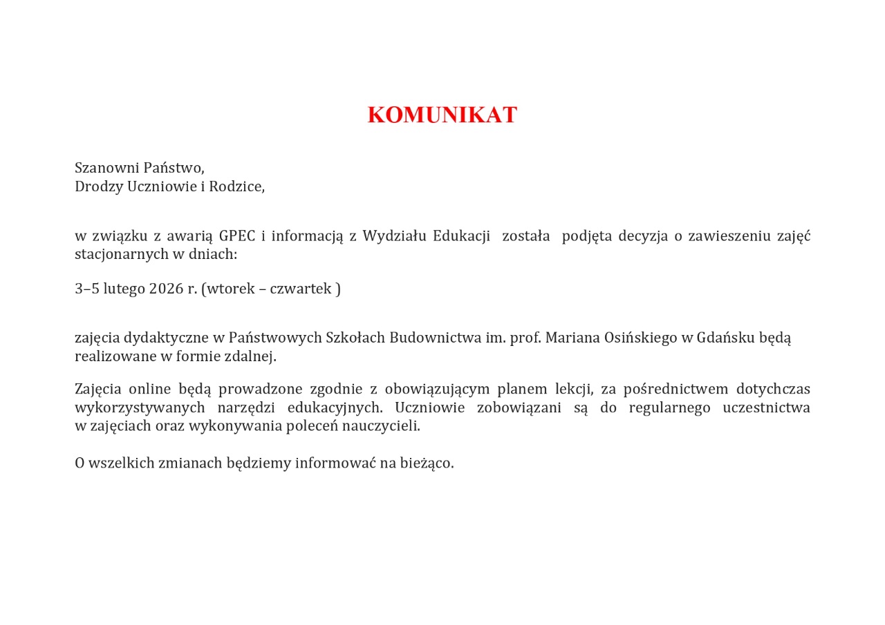 KOMUNIKAT - Państwowe Szkoły Budownictwa im. prof. Mariana Osińskiego (Technikum nr 5, Branżowa Szkoła I stopnia nr 5, Szkoła Policealna dla Dorosłych nr 5)